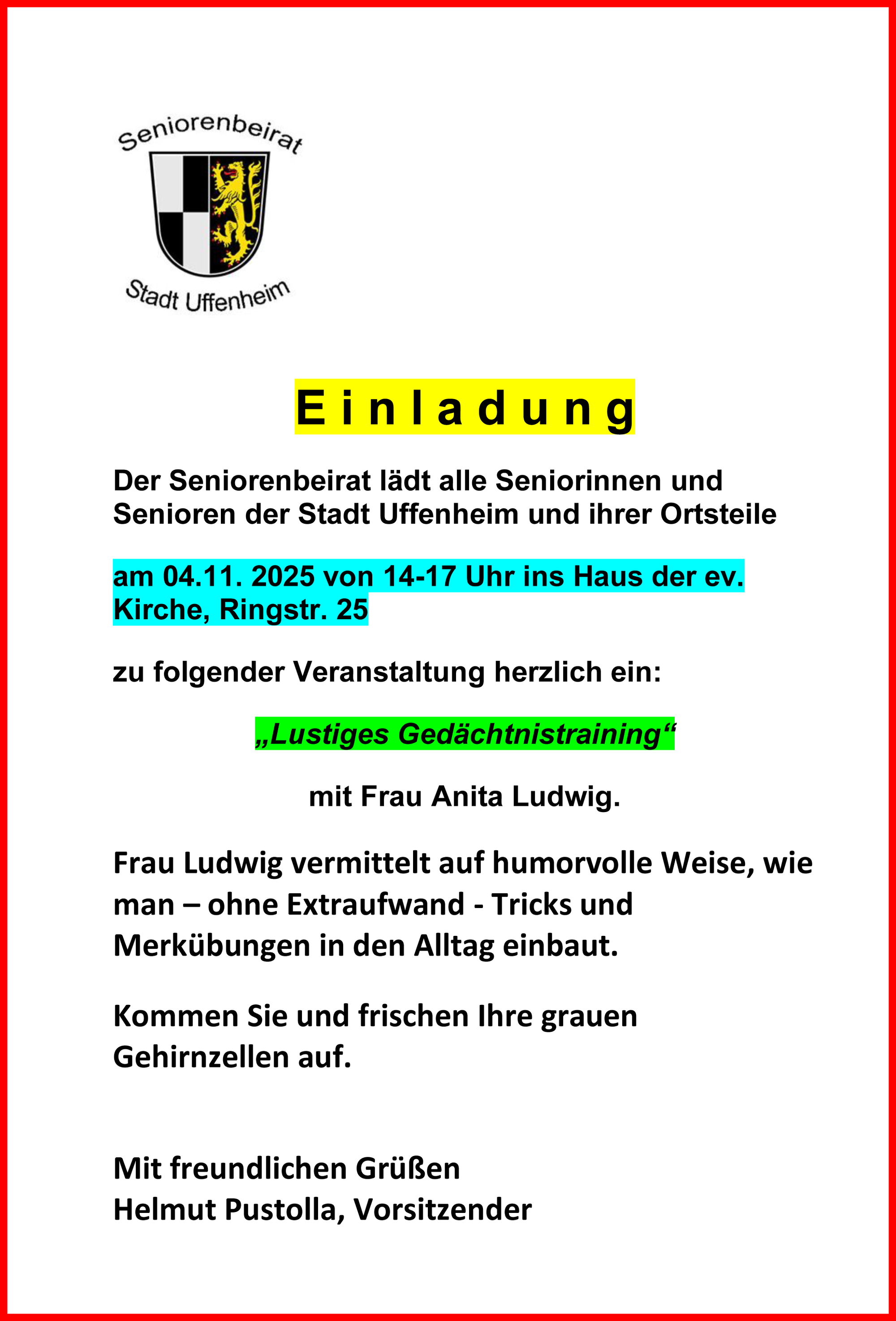 Der Seniorenbeirat lädt alle Seniorinnen und Senioren der Stadt Uffenheim und ihrer Ortsteile zu „Lustiges Gedächtnistraining“ mit Frau Anita Ludwig ein. Frau Ludwig vermittelt auf humorvolle Weise wie man – ohne Extraufwand - Tricks und Merkübungen in den Alltag einbaut. Kommen Sie und frischen Sie Ihre grauen Gehirnzellen auf.